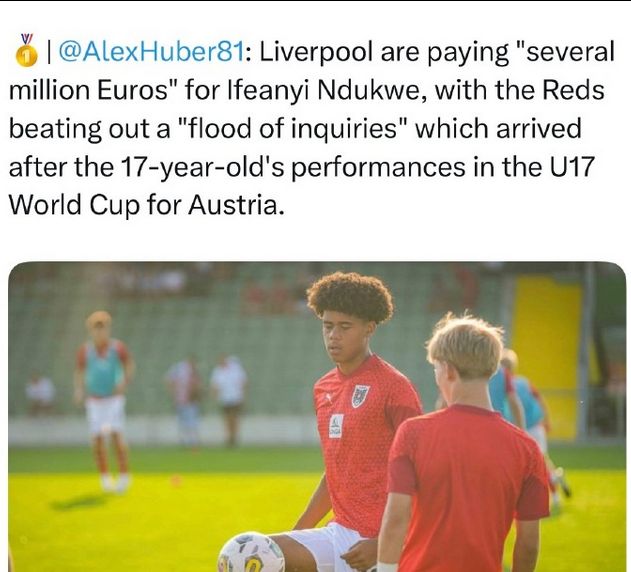 名記通稿:利物浦將在夏天簽下奧地利17歲中衛(wèi)Ifeanyi Ndukwe,后者是帶領(lǐng)奧地利殺入U17世界杯決賽的主力中衛(wèi)。利物浦在雪片似的報價中勝出,為此將付出幾百萬歐元。
